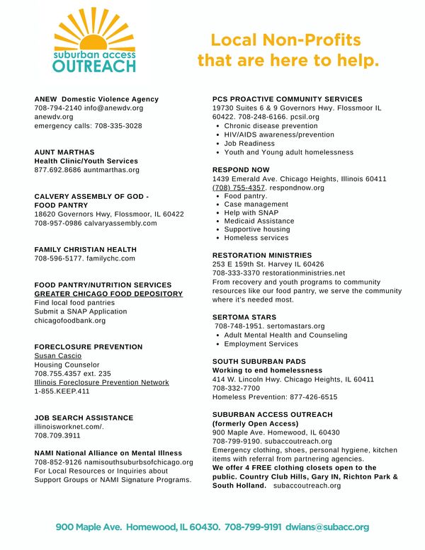 Food Pantry, serving those living in Flossmoor, Homewood, Chicago Heights, Hazel Crest, Homeless and those living in temporary housing. You may shop once a calendar month.